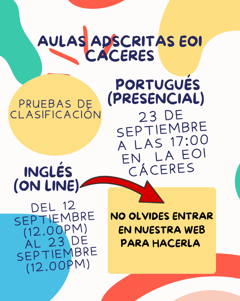 - Portugués (presencial): 23 de septiembre a las 17:00h en la EOI Cáceres