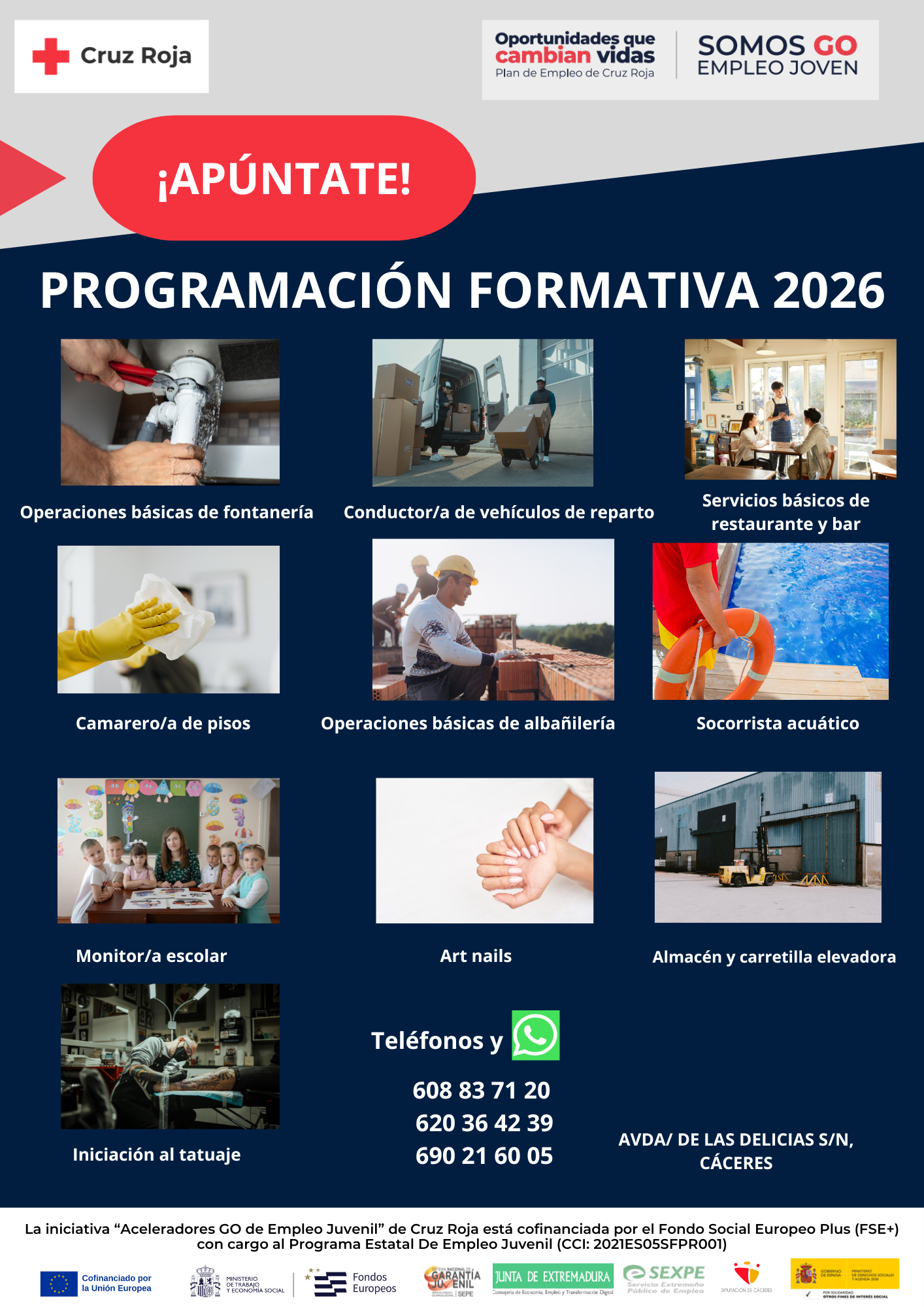 Desde la iniciativa "Aceleradores Go de Empleo Juvenil" de Cruz Roja, cofinanciado por el Fondo Social Europeo Plus (FSE+), con cargo al Programa Estatal de Empleo Juvenil (CCI: 2021ES05SFPR001) lanzamos nuevas Acciones Formativas para el año 2026. Adjuntamos el cartel de la formación planificada para el año 2026 y los carteles de las formaciones del primer trimestre: