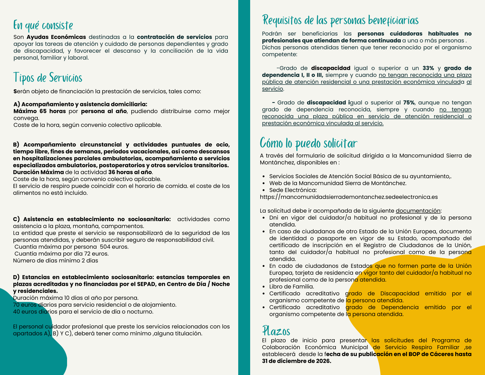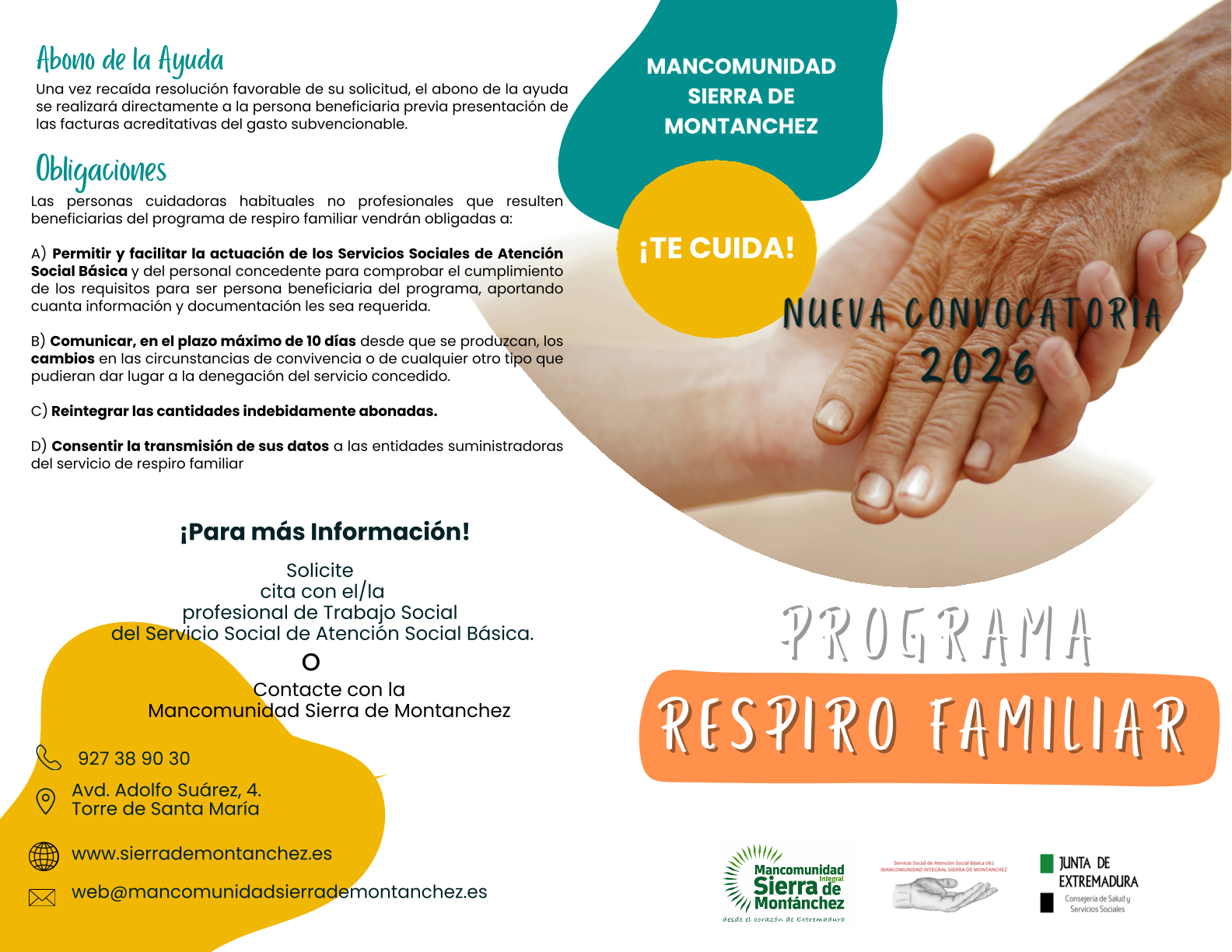 La Mancomunidad Integral Sierra de Montánchez pone a disposición de las personas cuidadoras habituales no profesionales el Programa de Colaboración Económica Municipal del Servicio Respiro Familiar 2026, destinado a apoyar y facilitar la conciliación de la vida personal, familiar y laboral de quienes atienden de forma continuada a personas dependientes o con discapacidad.