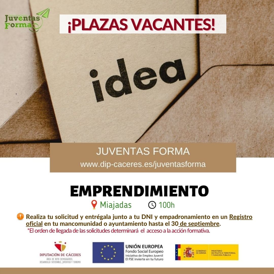Desde el Proyecto Juventas Forma de Diputación de Cáceres, cofinanciado por el FSE al 91,89%, y que tiene como objetivo la inserción laboral y mejora del empleo de las personas menores de 30 años inscritas en el Sistema Nacional de Garantía Juvenil, remitimos información para la difusión de la acción formativa "Emprendimiento" de 100h que desarrollaremos en la localidad de Miajadas y para la que hemos abierto un plazo extraordinario de solicitudes ante la falta de alumnado hasta el día 30 de septiembre de 2021. Necesitamos un mínimo de 10 personas participantes para poder iniciar.